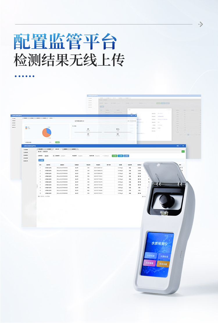 配置监管平台,检测结果可直接无线传至平台,进行水质长短期分析,辅助管理。