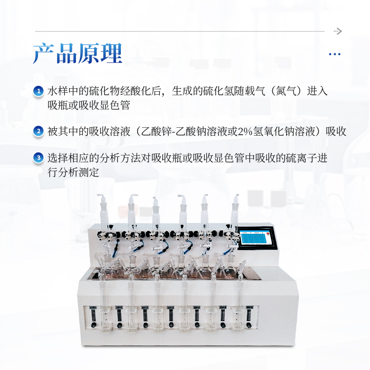 水样中的硫化物经酸化,生成的硫化氢随载气(氮气)进入吸收瓶/吸收显色管中被吸收溶液(乙酸锌-乙酸钠溶液或2%氢氧化钠溶液)吸收,选择相应的分析方法对吸收瓶/吸收显色管中吸收的硫离子进行分析测定。
